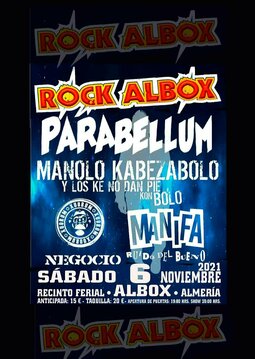 El Festival ROCK ALBOX cumple 36 ediciones con un programa muy especial. MENUDO CARTEL!!! > PARABELLUM + MANOLO KABEZABOLO + MANIFA + XUORUM + NEGOCIO.