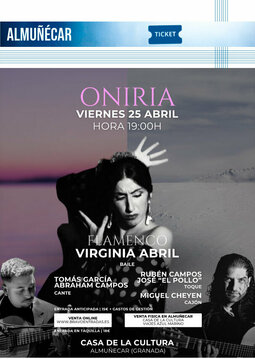 ONIRIA, con Virginia Abril, nuevo espectáculo para la programación flamenca de Almuñécar. Junto al baile de Virginia Abril, están, sobre las tablas, Tomás García y Abrahan Campos al cante; Rubén Campos y José 'El Pollo' a la guitarra; y las percusiones, al cajón, de Miguel Cheyen.
