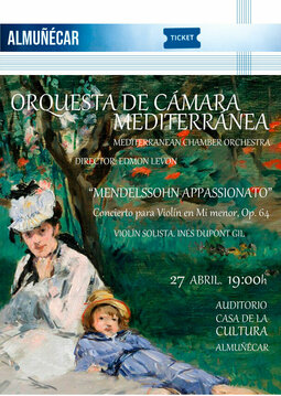 La ORQUESTA DE CÁMARA MEDITERRÁNEA cierra con el concierto de abril su temporada de conciertos en la Casa de la Cultura. En el mes de septiembre iniciaremos una nueva temporada y quizás con un concierto deverano en el Parque del Majuelo. En el próximo concierto titulado "Mendelssohn Appassionato" presentamos a una jovencísima violinista granadina, INÉS DUPONT GIL, que nacida el año 2010, ya ha sido admitida como alumna de la Escuela Superior de Música Reina Sofía, becada por la Fundación Albéniz. La escucharemos como solista en el concierto para violín en Mi menor Op. 64 MWV 014 de F. Mendelssohn.